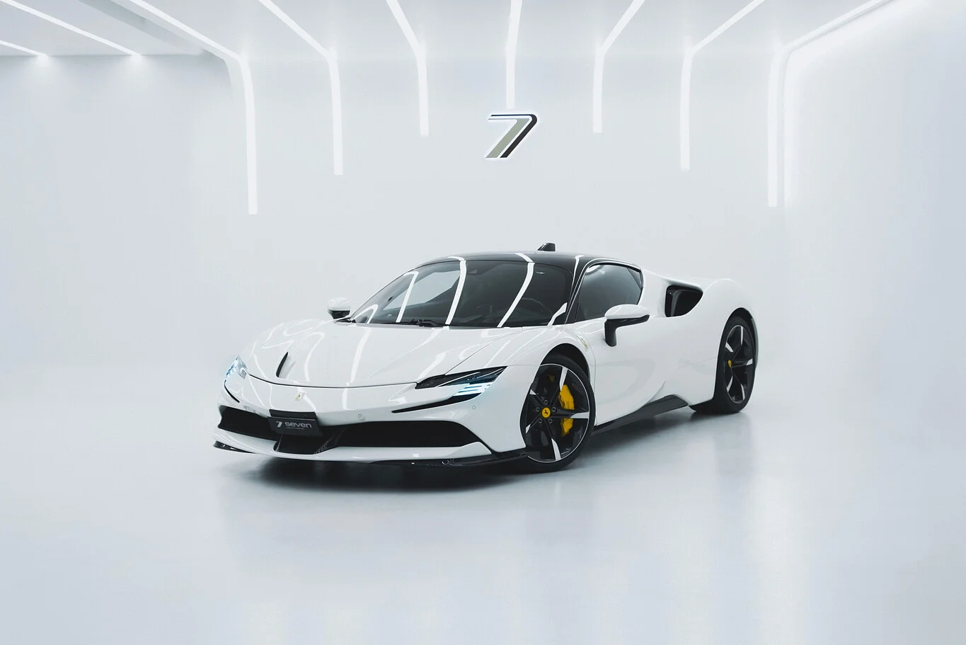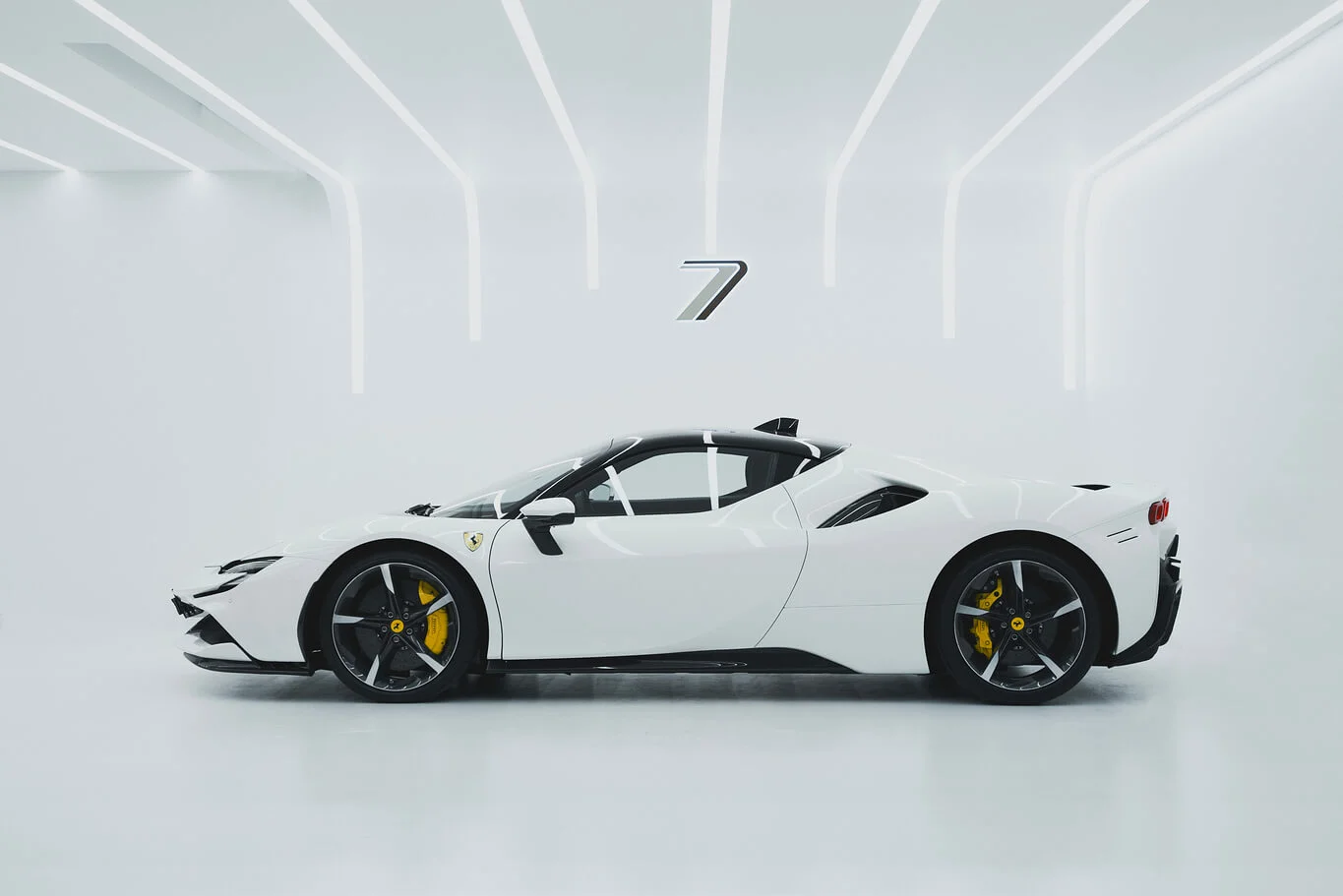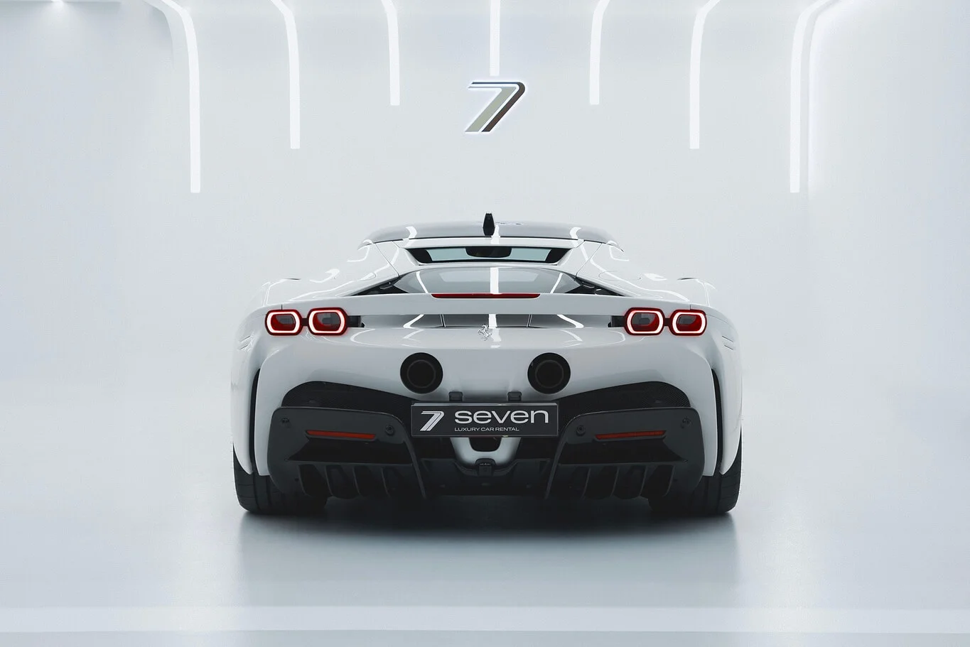 White SF90 variant for clients who want the same flagship Ferrari presence with a brighter spec. Pricing changes automatically by rental duration.