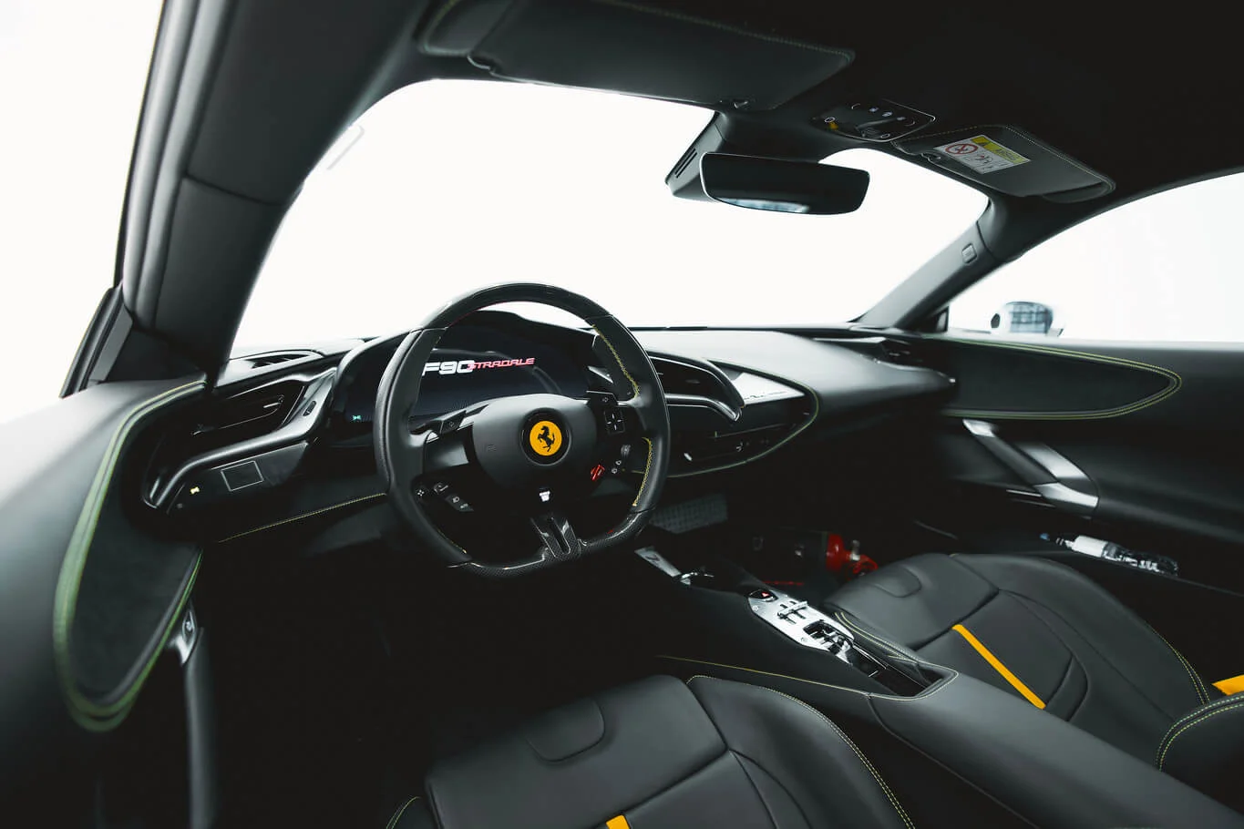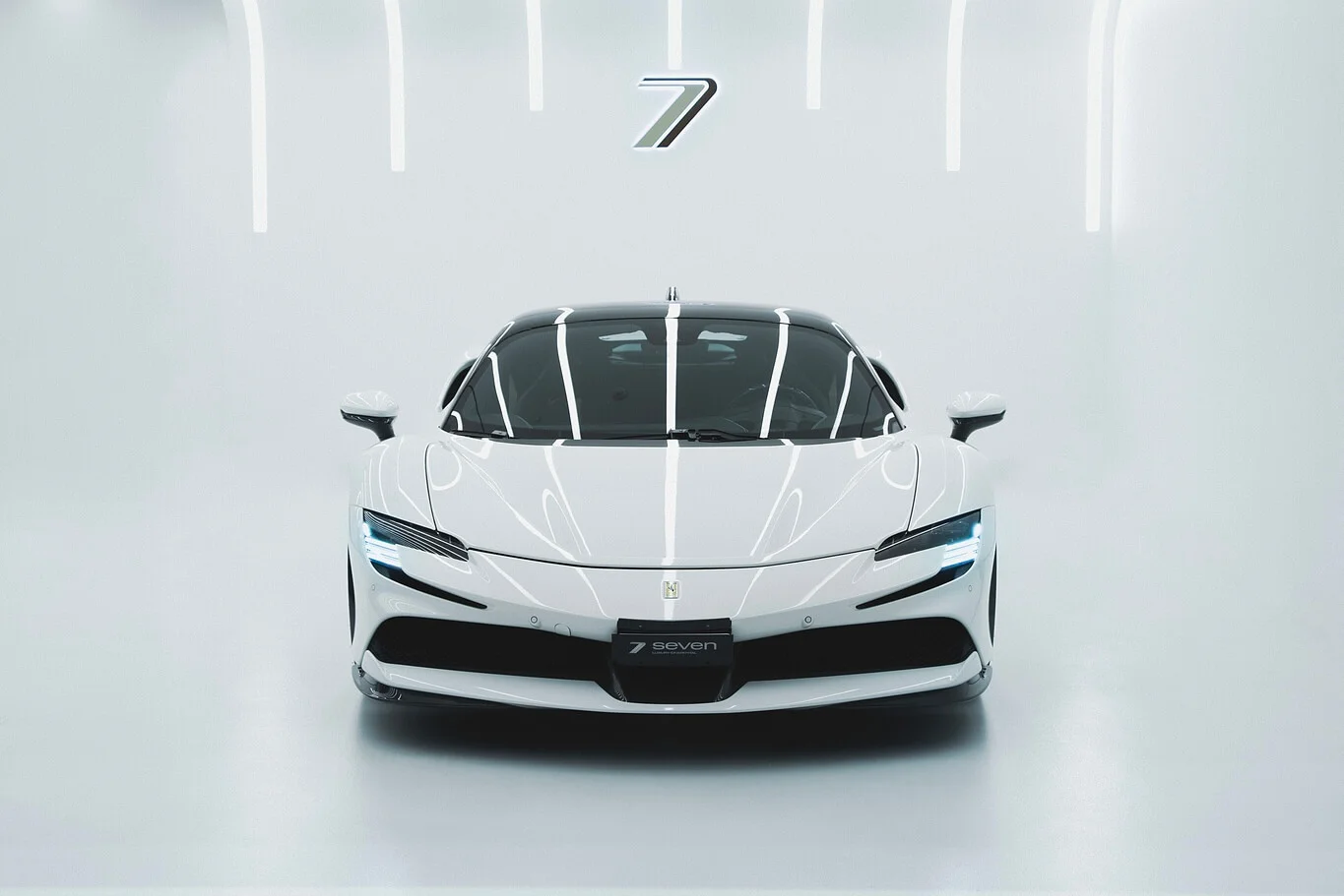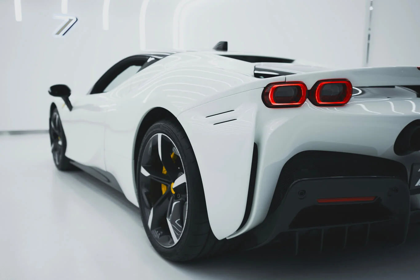 White SF90 variant for clients who want the same flagship Ferrari presence with a brighter spec. Pricing changes automatically by rental duration.